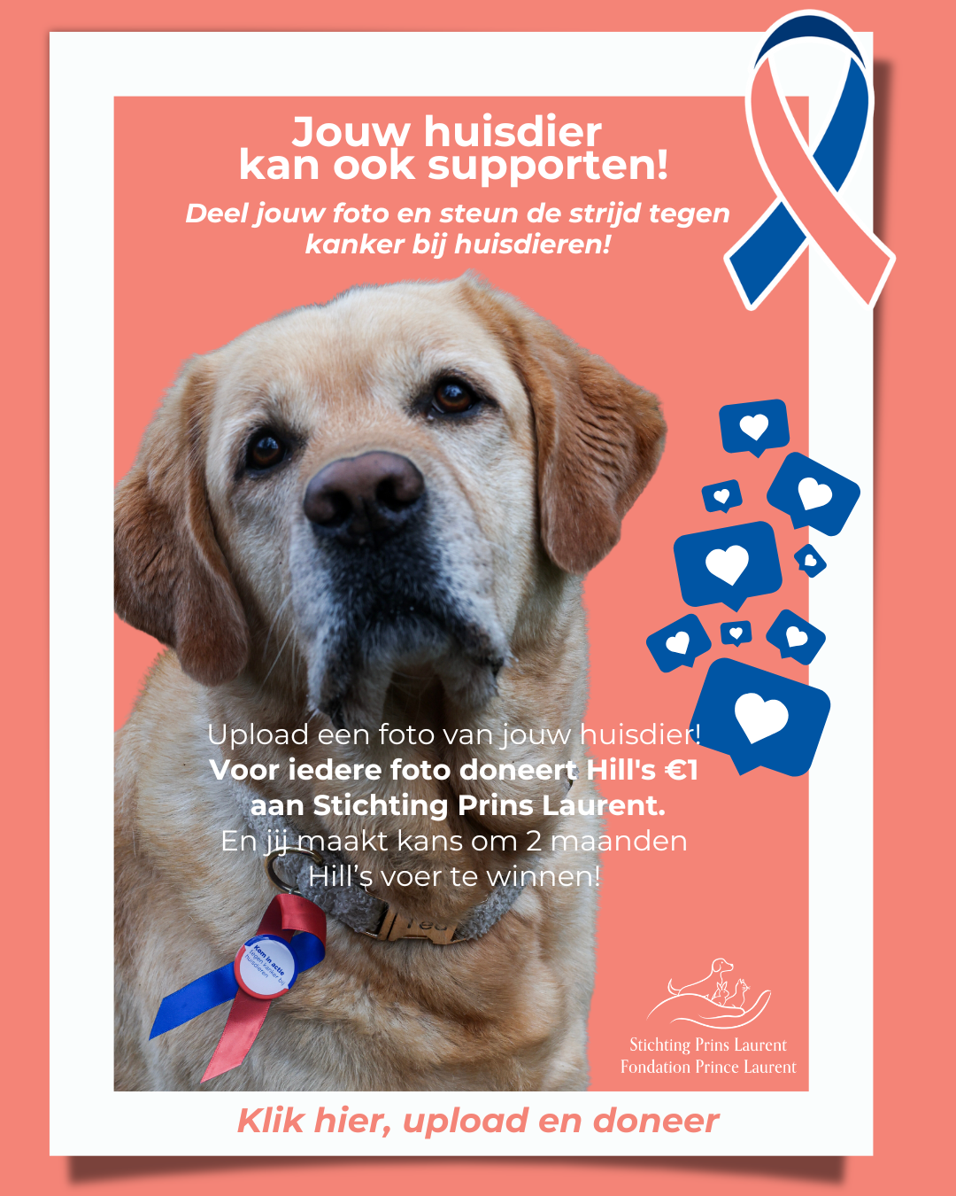 Hill’s zet zich samen met Stichting Prins Laurent in om huisdieren in België een eerlijke kans te geven in de strijd tegen kanker en jij kunt daarbij helpen! Volg ons op Social Media en doe mee aan onze fotowedstrijd. Voor iedere foto doneren wij 1€ aan Stichting Prins Laurent. Of schrijf je in voor de Hill's Nieuwsbrief om op de hoogte te blijven van al het nieuws rondom de Pet Cancer Awareness campagne.