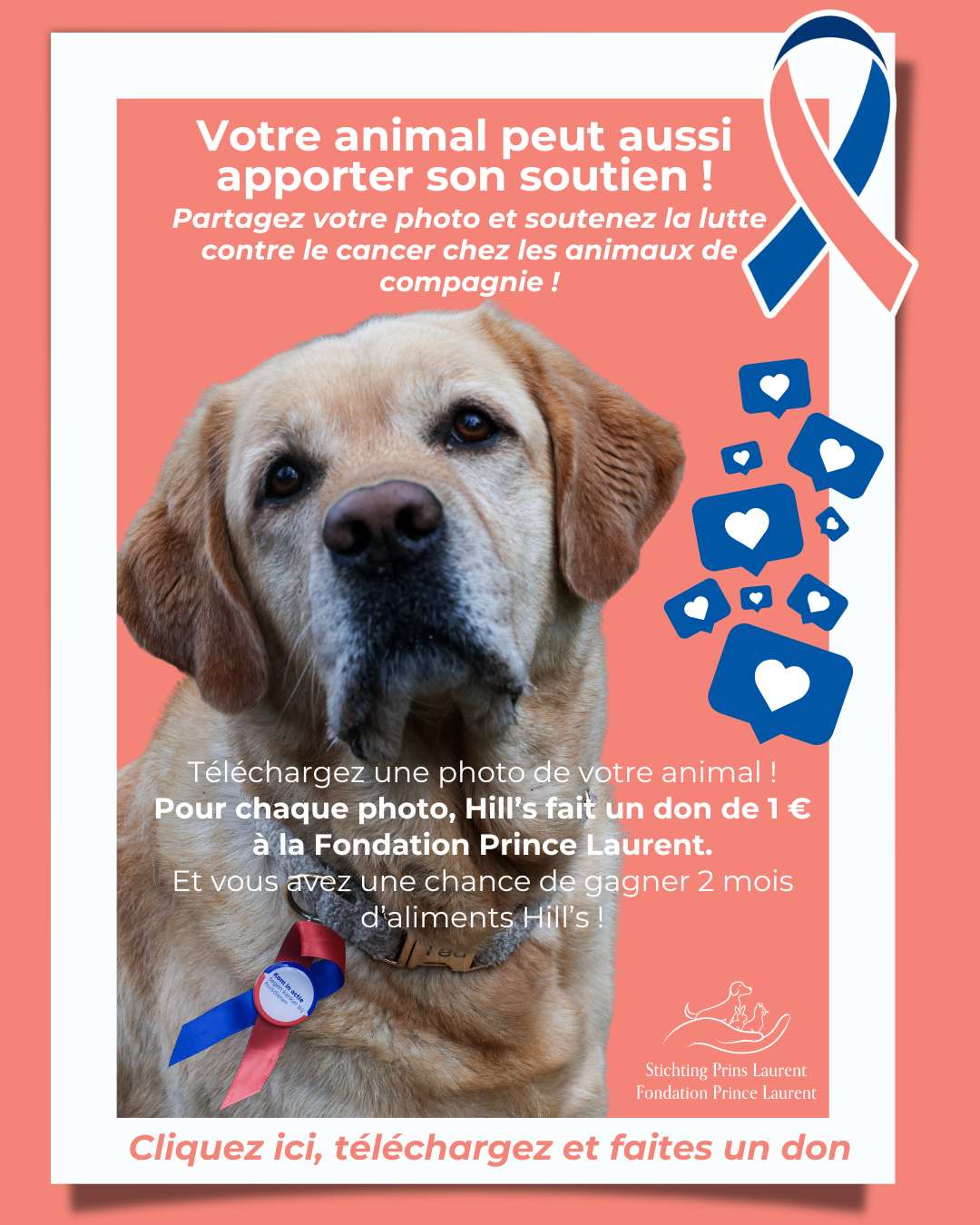 En collaboration avec la Fondation Prince Laurent, Hill's s'engage à donner une chance équitable dans la lutte contre le cancer des animaux de compagnie en Belgique et vous pouvez y contribuer ! Suivez-nous sur les réseaux sociaux et participez à notre concours photo. Pour chaque photo postée, nous reversons 1€ à la Fondation Prince Laurent. Ou bien, inscrivez-vous à la newsletter Hill's pour rester informé de toutes les nouvelles concernant la campagne de Sensibilisation au Cancer des Animaux de compagnie.